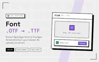 OTF till TTF Converter är ett kostnadsfritt tillägg för Chrome som möjliggör lokal konvertering av OpenType-fonter till TrueType-format. Med drag-och-släpp-stöd kan användare enkelt omvandla flera OTF-filer utan att behöva ladda upp något till en server. Tillägget fungerar helt offline, vilket garanterar att all data förblir privat och säker under hela konverteringsprocessen. Det är idealiskt för grafiska formgivare, webb utvecklare och typografi professionella som behöver konvertera typsnitt utan att kompromissa med sekretessen.